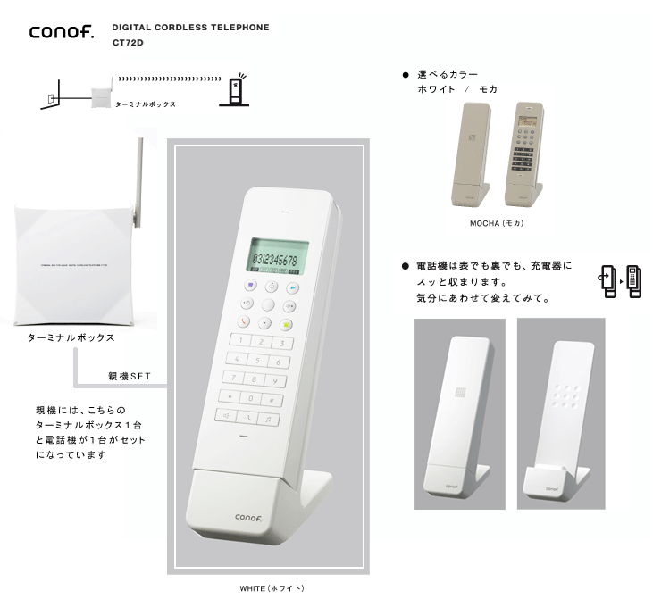 ココチノヨイ カイワ。conof.デジタルコードレステレフォン 【CT72D】親機セット(子機+ターミナルBOX) 価格: 21,000円 レビュー評価: 0.0 レビュー数:0 ※パソコンの環境状況により、実際のお色と異なる場合がございますので予めご了承くださいませ。商品名conof. デジタルコードレステレフォン 【CT72D】 親機セット 商品説明本体と充電器を一体化することで可能にした無駄のないシンプルなデザイン 余計なものをなくして実現したスマートなフォルムは、ただそこに置いておくだけで、お部屋をスタイリッシュに演出します★ ※ご注文頂いてから発送まで、1週間?10日ほどお時間頂きます。 ※また、稀に欠品する場合もございますので予めご了承お願いいたします。 電源AC100V 50/60Hz 定格消費電力待機時:0.8W 充電中:2.5W サイズ【ターミナルBO Supported by 楽天ウェブサービス |